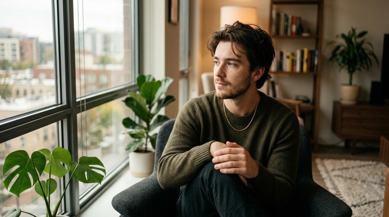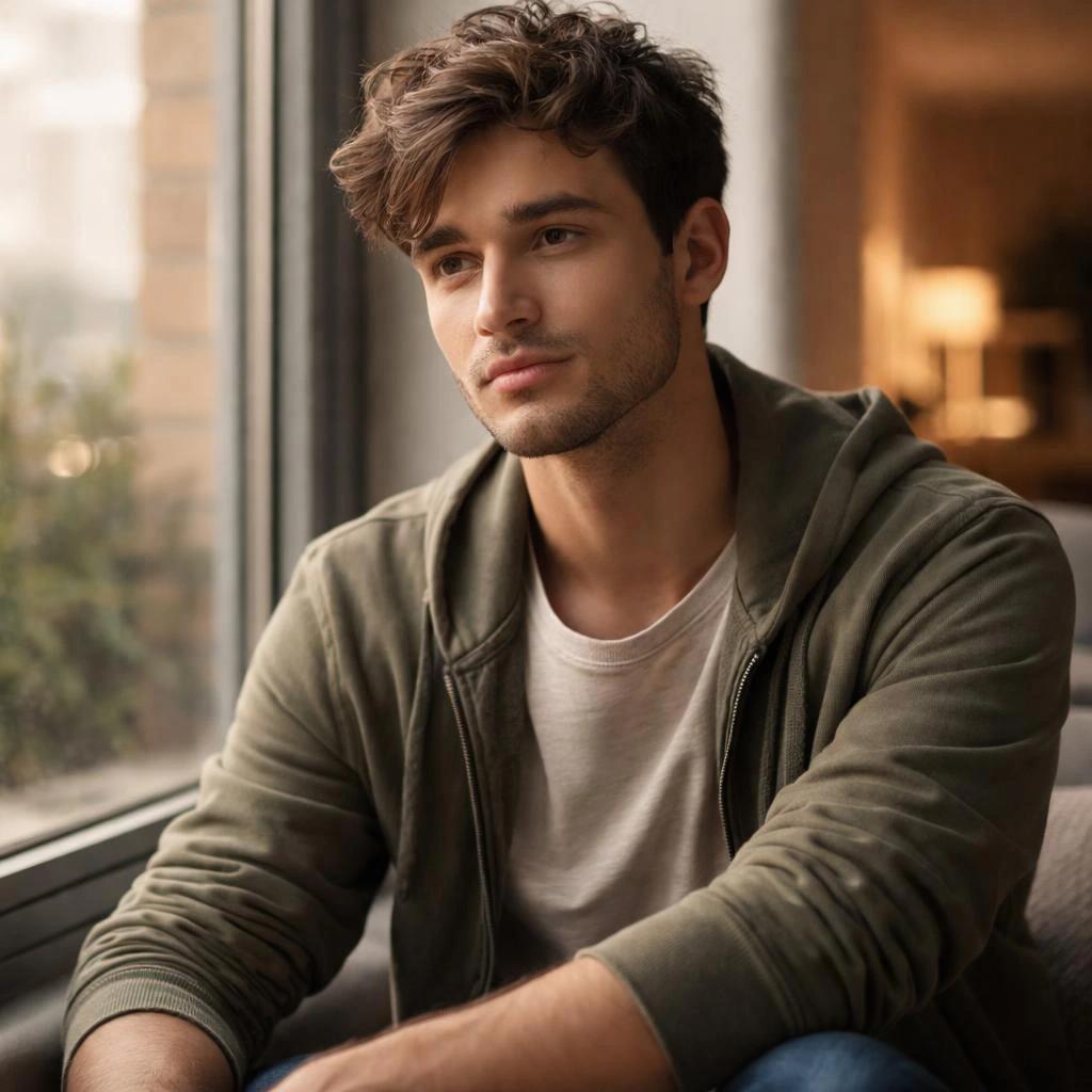 A photorealistic portrait of a young man sitting by a window in a modern apartment, soft natural morning light illuminating his face. He is wearing casual clothing and looking slightly away from the camera. The background is softly blurred with warm interior tones. Detailed skin texture, natural lighting and shadows, shallow depth of field, 50mm lens, cinematic composition, high detail.
