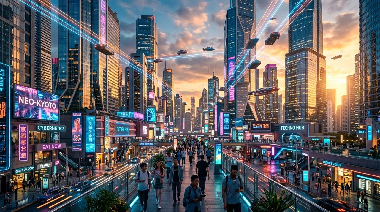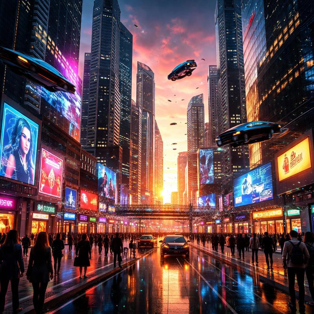 A cinematic, ultra realistic scene of a futuristic city at sunset, with neon lights reflecting off glass skyscrapers. Flying cars move through the air in organized traffic, while pedestrians walk along a busy street filled with digital billboards. Warm golden sunlight mixes with cool neon lighting, creating strong contrast and reflections. Wide angle composition, highly detailed, sharp focus, depth of field, 8k quality.