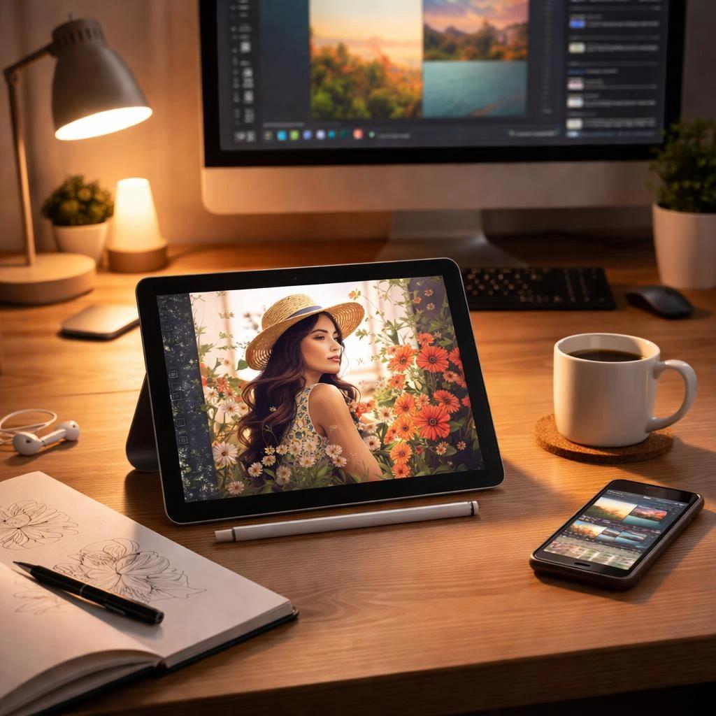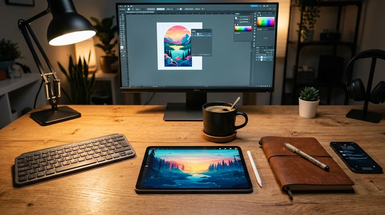A modern creative studio desk setup with a tablet displaying a digital illustration, a wireless keyboard, a smartphone, a sketchbook, and a cup of coffee. Soft warm lighting from a desk lamp creates gentle shadows across a wooden desk. A large monitor in the background shows a design interface. Minimalist aesthetic, clean composition, realistic textures, depth of field, high detail, 4k quality.