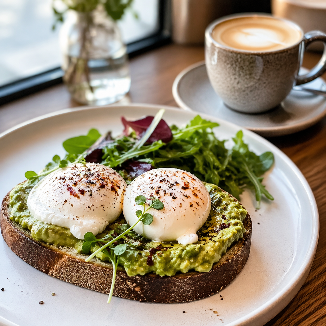A close-up of a freshly made brunch plate with avocado toast, poached eggs, and a cup of coffee, natural window lighting, shallow depth of field, soft shadows, realistic food photography style, high detail