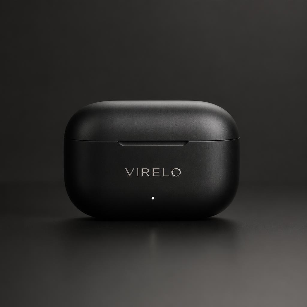 Minimalist product mockup of a black wireless earbuds case on a matte surface, soft studio lighting, subtle reflections, clean background, premium branding style