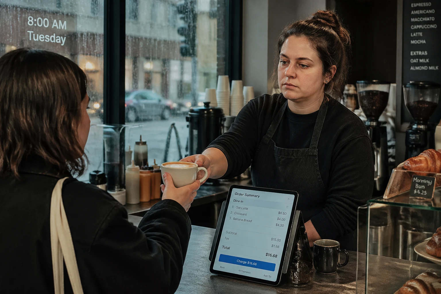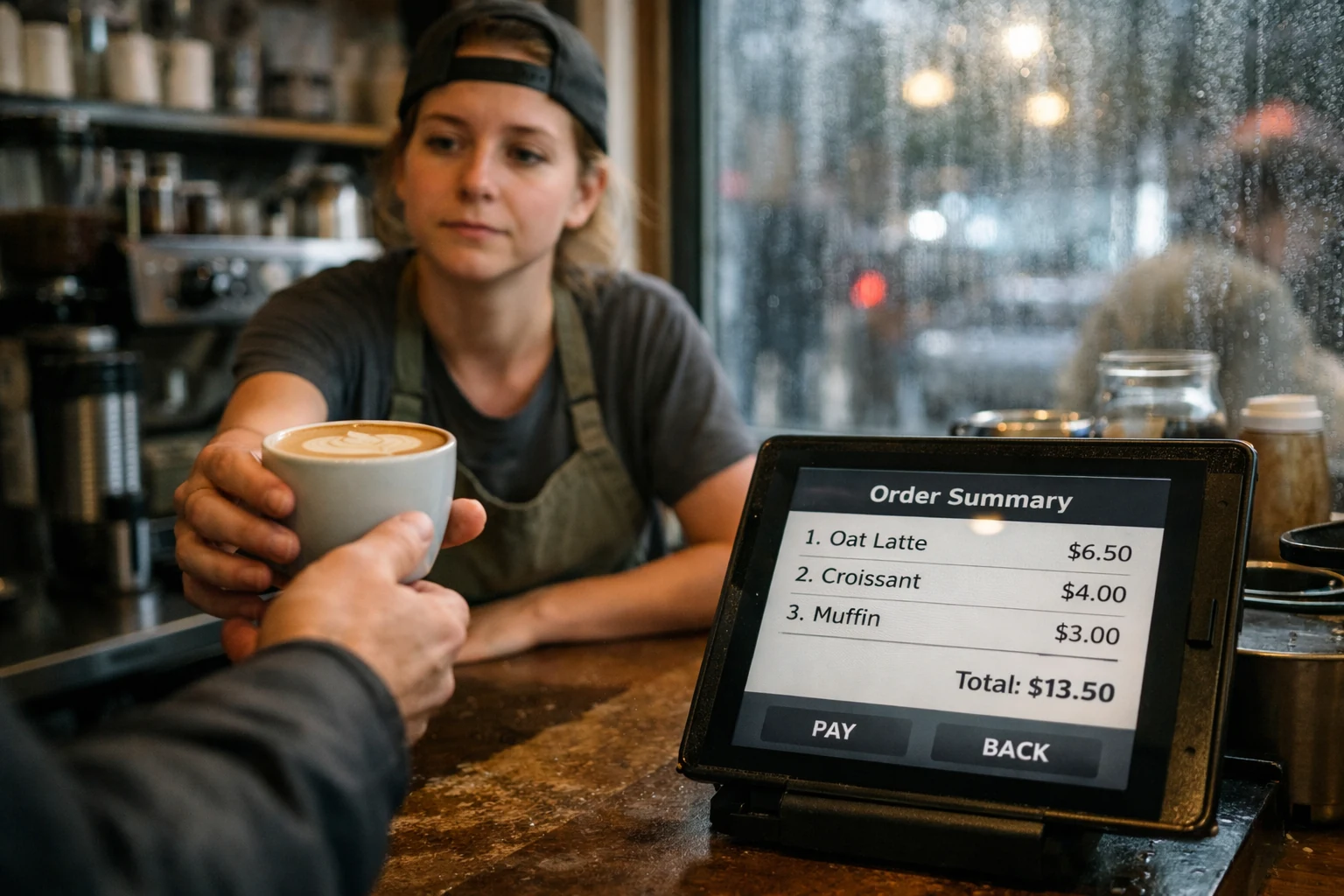 A realistic, eye-level candid photograph taken with a Fujifilm camera. A weary barista is handing a latte to a customer across a bustling independent coffee shop counter at 8:00 AM on a rainy Tuesday. On the counter is a functional, authentic POS screen (tablet) showing a visible, readable "Order Summary" with three line items such as "1. Oat Latte $6.50", "2. Croissant $4.00", and "3. Americano $5.00". Natural soft lighting from the window, visible condensation on the shop glass, high-end documentary photography style, shallow depth of field focusing on the exchange and the screen, authentic atmosphere.