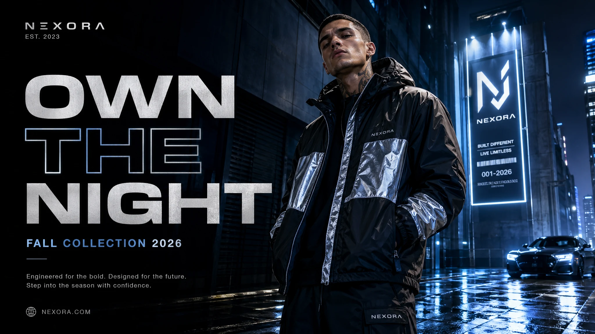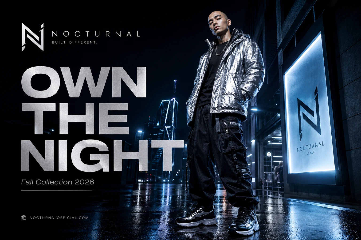 A luxury fashion campaign poster for a modern streetwear brand. Confident model standing in a futuristic urban alley at night, neon reflections on wet pavement, cinematic blue and silver lighting, bold magazine-style composition, premium editorial photography, clean headline text "OWN THE NIGHT", smaller subtext "Fall Collection 2026", stylish modern typography, high-end billboard advertisement layout.