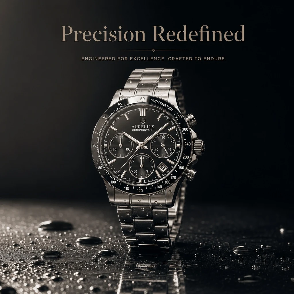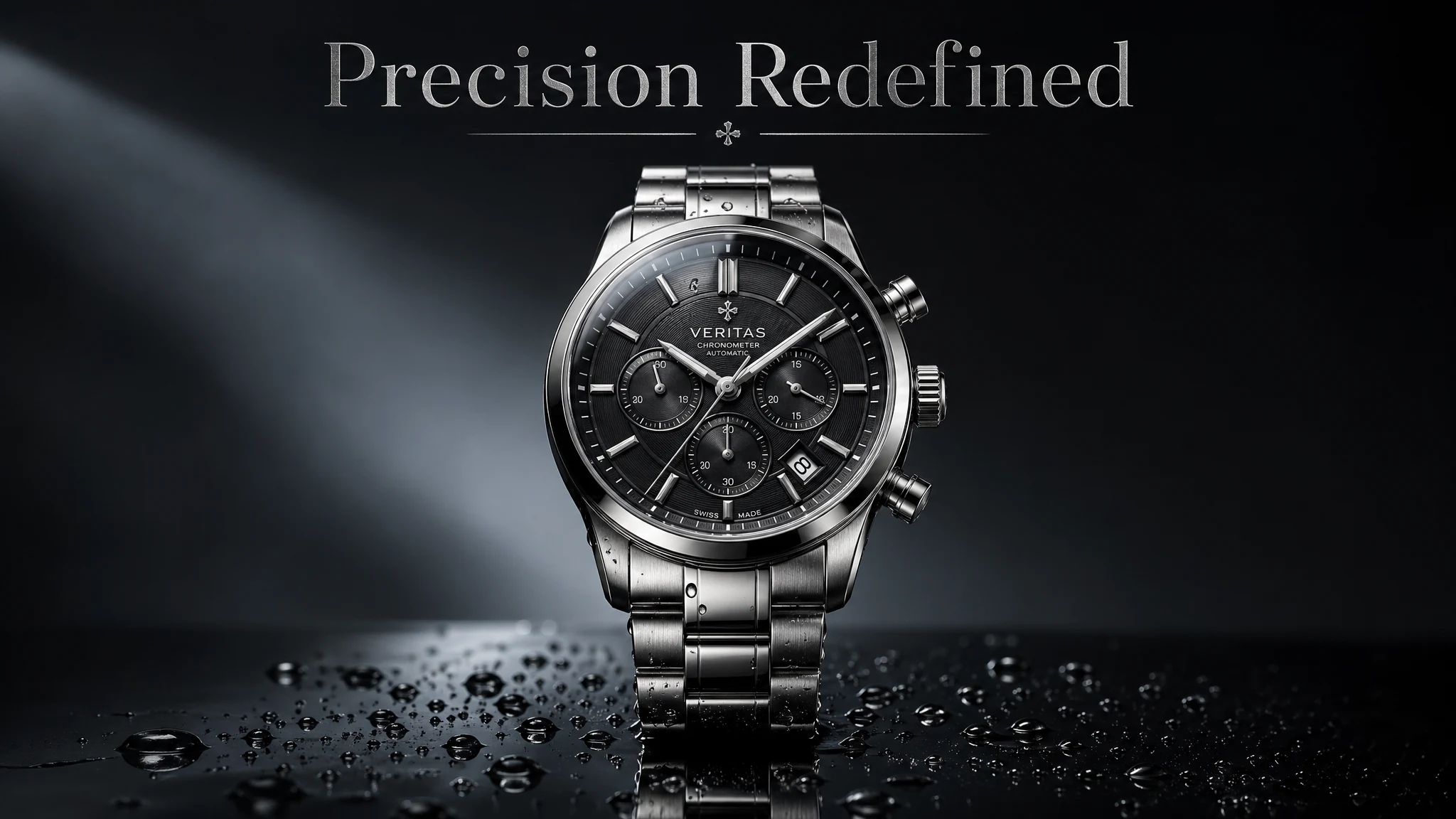 A premium stainless steel wristwatch standing upright on a black reflective surface, water droplets around the base, dramatic side lighting, visible engraved dial details, realistic glass reflections, cinematic luxury campaign style, dark gradient background, headline text "Precision Redefined" at the top.