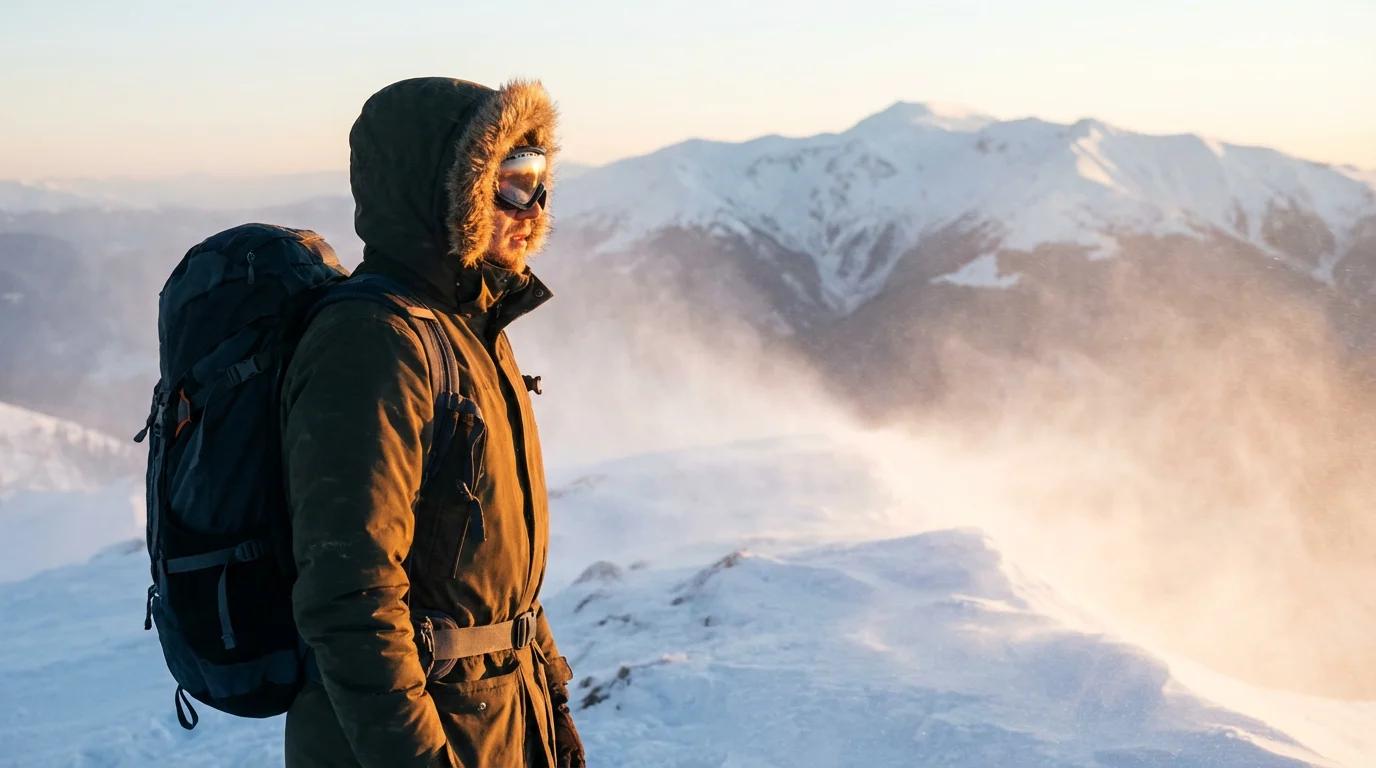 Prompt: A traveler standing on a snowy ridge at sunrise, camera slowly drifting from a side profile to a front-facing cinematic reveal, warm golden light, mountain winds, highly realistic atmosphere. Use image_1 as the start frame.