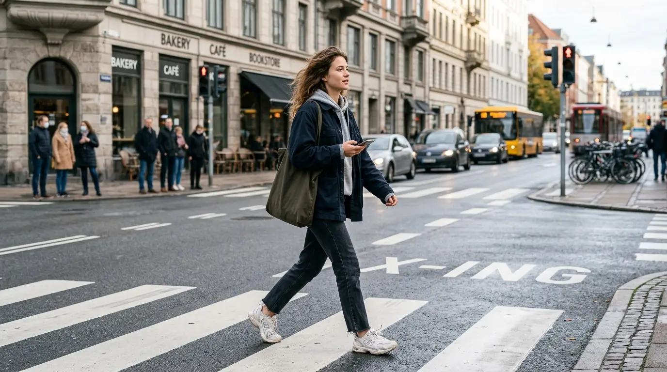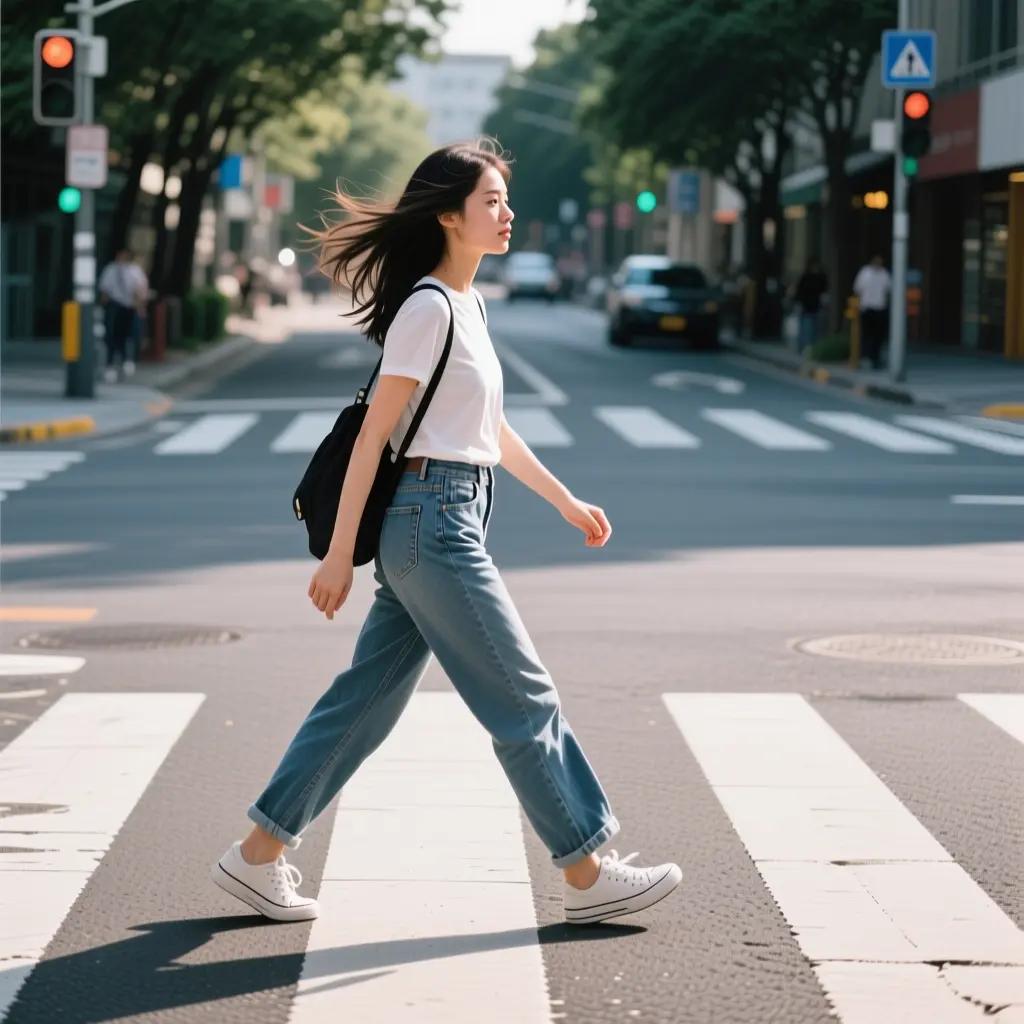 a street-style photo of a young woman walking across a pedestrian crossing, casual outfit, natural lighting, slightly windy, realistic photography