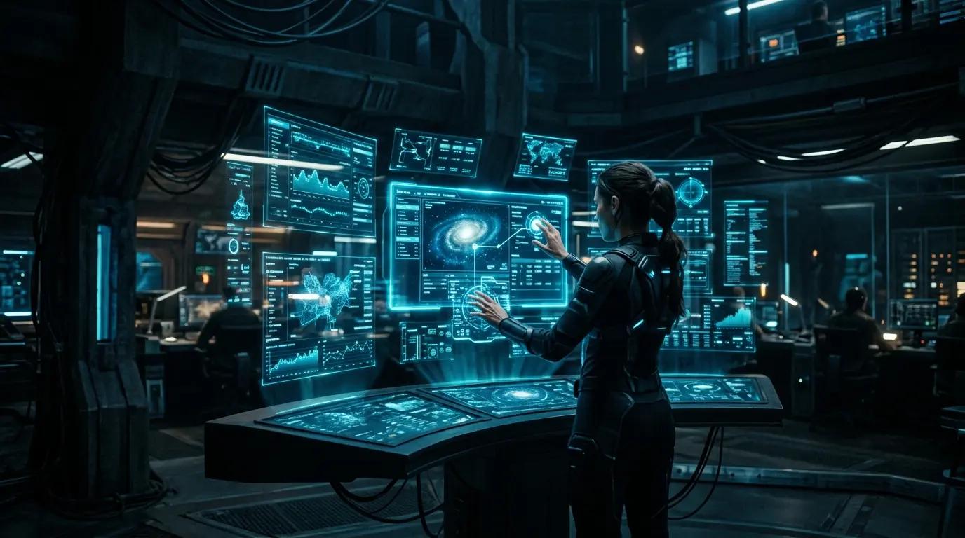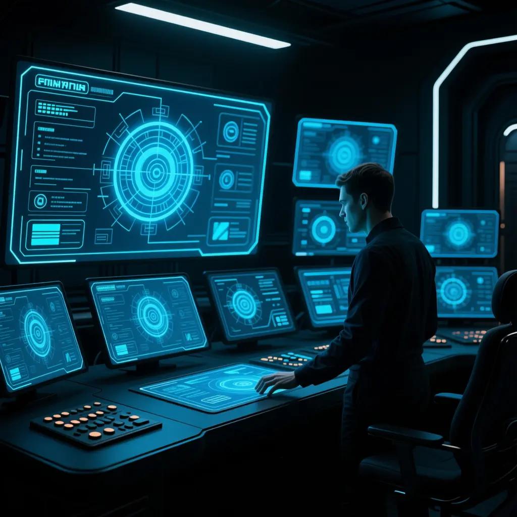 a futuristic control room with multiple holographic screens, glowing blue interface, a person interacting with the system, dark environment, cinematic lighting, high detail