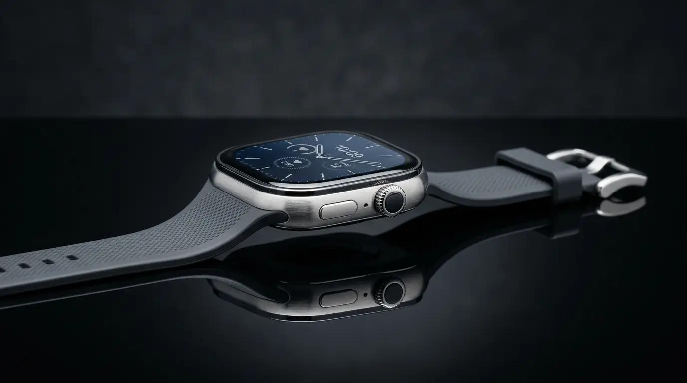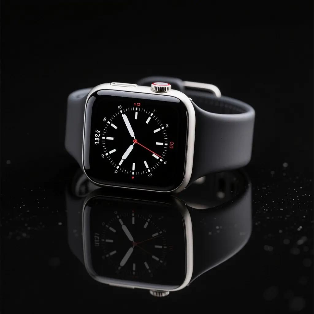 a premium smartwatch on a black reflective surface, studio lighting, sharp reflections, minimal luxury style, high detail