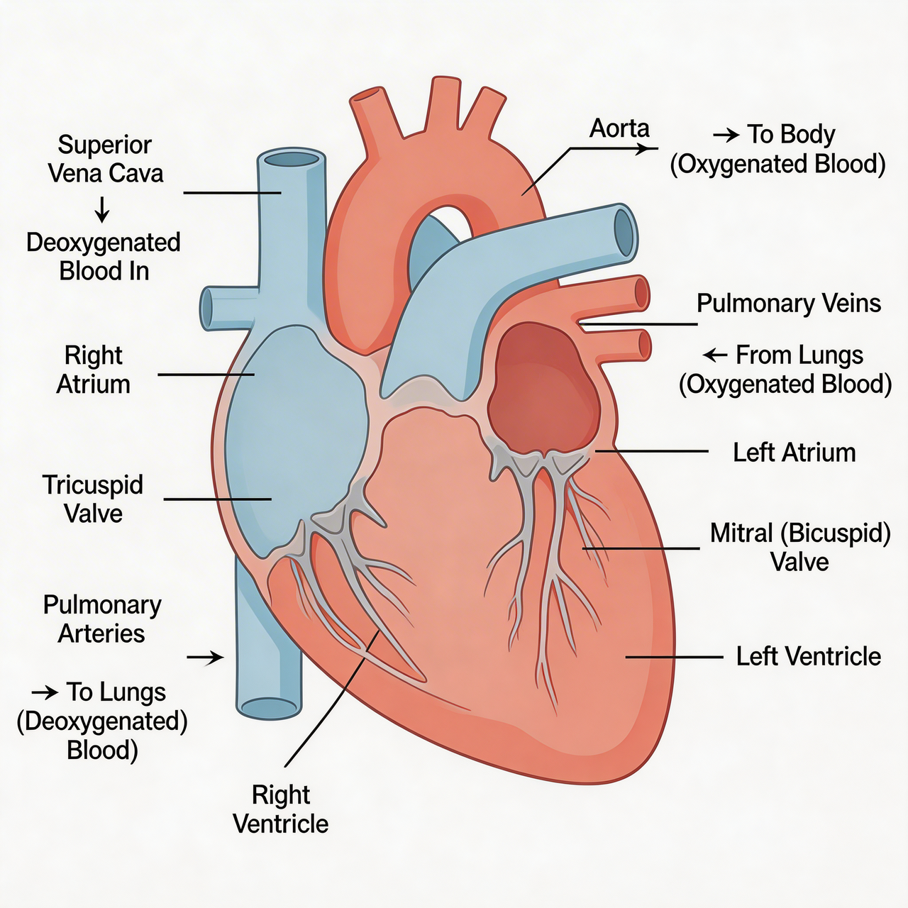 A clean labeled diagram of the human heart, showing internal structure and blood flow, educational style, clear annotations, minimal design, soft color palette, high clarity, vector-style illustration, white background