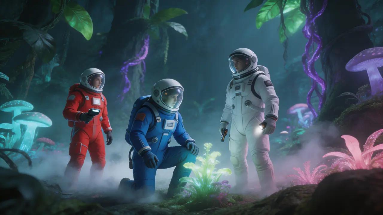 A group of three astronauts exploring an alien jungle, glowing bioluminescent plants, misty atmosphere, cinematic lighting, each astronaut wearing a different colored suit (red, blue, and white), ultra-detailed, high realism, wide-angle composition