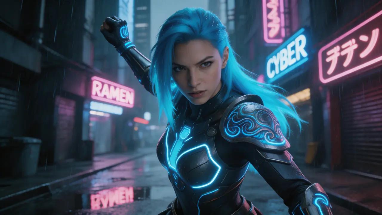 A cyberpunk female warrior with neon blue hair, glowing armor with intricate details, standing in a rainy futuristic city alley, neon signs reflecting on wet pavement, cinematic lighting, shallow depth of field, ultra-detailed, 4K, dramatic atmosphere, dynamic pose