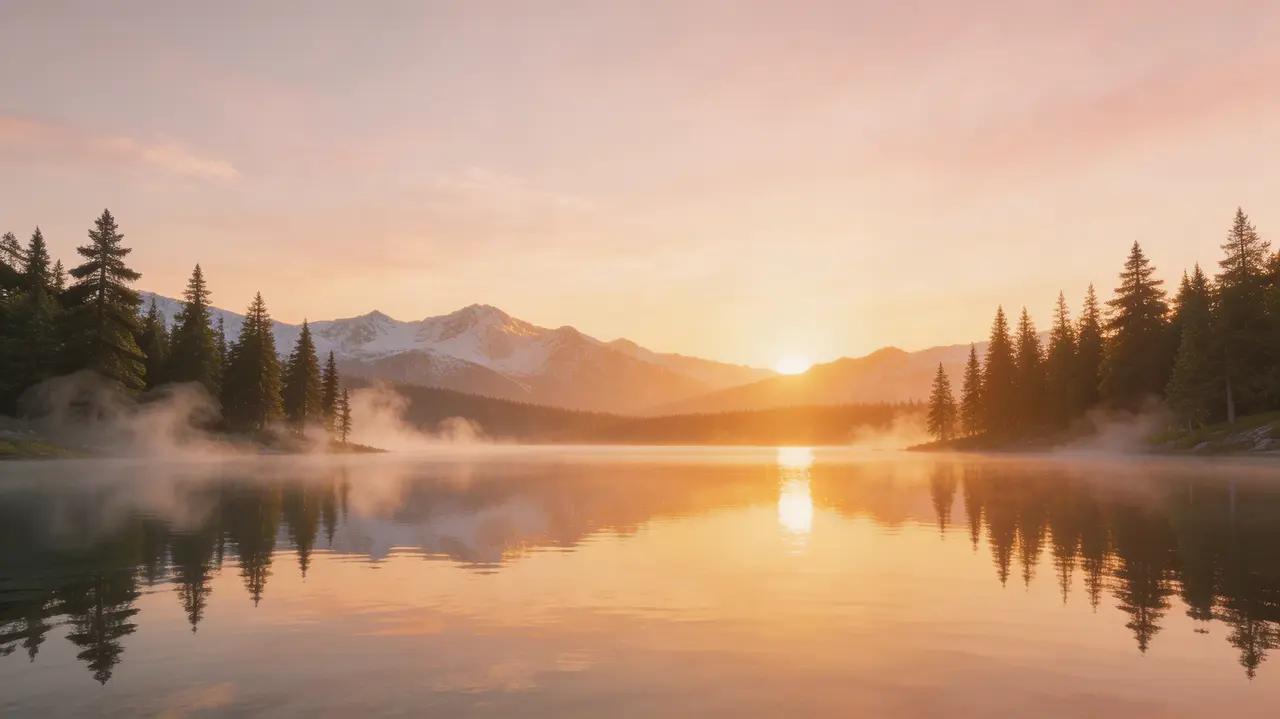 A serene mountain lake at sunrise, soft golden light reflecting on the water, mist floating above the surface, surrounded by pine trees, ultra-realistic, cinematic composition, high detail, calm atmosphere, 4K, wide-angle shot