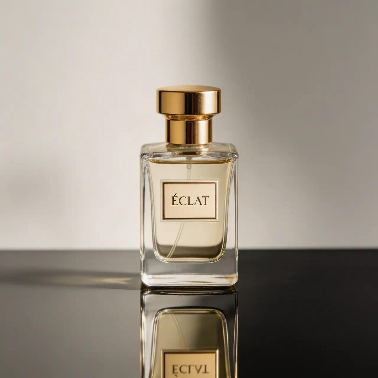 A luxury perfume bottle placed on a reflective glass surface, soft studio lighting with elegant shadows, minimal background, premium product photography style, ultra-detailed, 4K, high-end aesthetic, sharp focus, subtle reflections