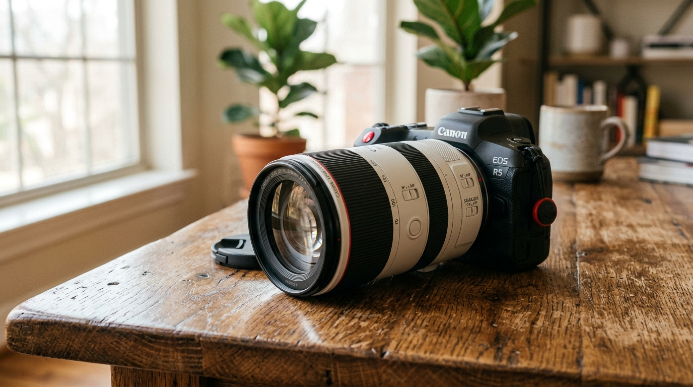 Prompt: A slow cinematic close-up shot with gentle camera orbit, a professional DSLR camera with a large lens, rotating slightly as the focus ring turns subtly and light glides across the lens glass, placed on a wooden surface in a softly lit indoor environment with natural side lighting, warm natural aesthetic with soft shadows, detailed textures, and high-end commercial realism.